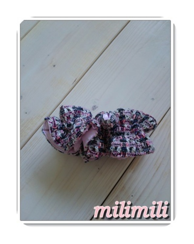 ★リントンツイード シュシュ PINK★ ピンク系MIXツイード×ピンクサテンのシュシュです。 布幅:約6cm 一周:約70cm ゴム:真ん中に約1cm幅 長さ:約20cm